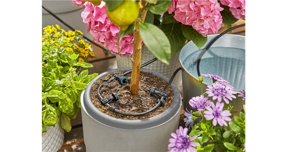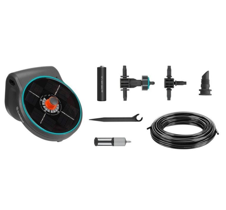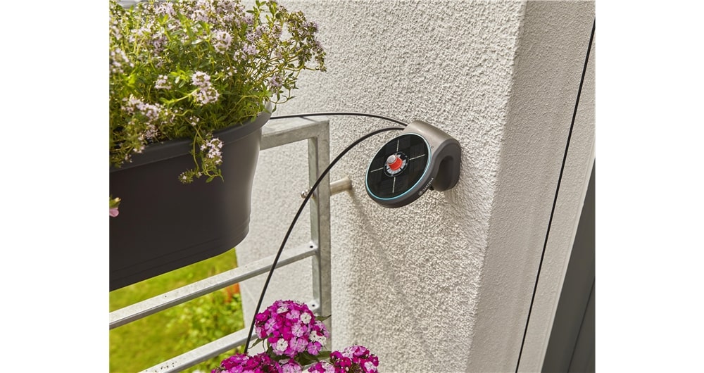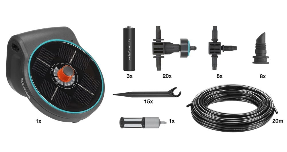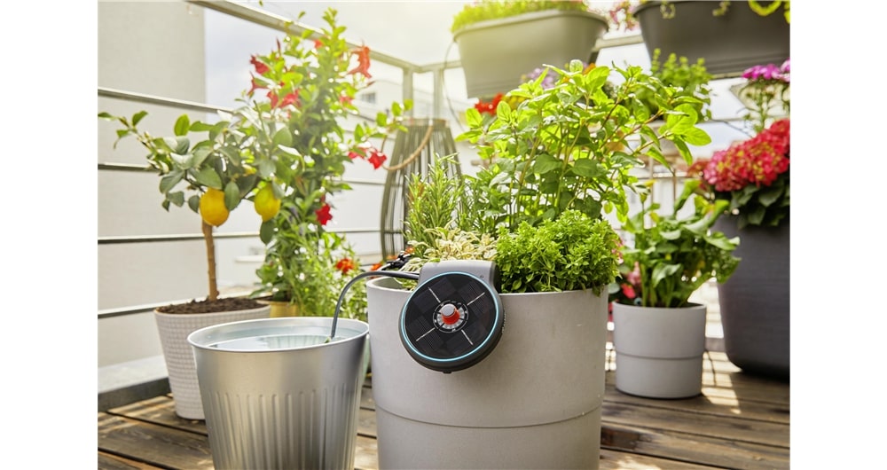 Met GARDENA AquaBloom zijn jouw balkon- en potplanten in goede handen, zelfs als je niet thuis bent. Dit handige systeem werkt zonder waterkraan of stroomvoorziening in jouw tuin of op jouw terras. Je hoeft alleen te zorgen voor een gevuld waterreservoir. De AquaBloom-set is een compleet gebruiksklaar irrigatiesysteem met een 3-in-1 hoofdunit. Het bevat een pomp om water aan te zuigen, een besproeiingscomputer om het bewaterschema in te stellen, en een zonnepaneel dat de meegeleverde oplaadbare batterijen oplaadt.