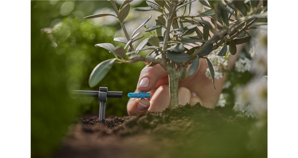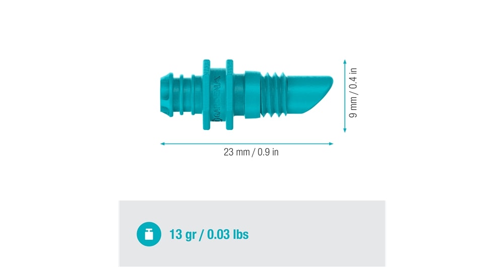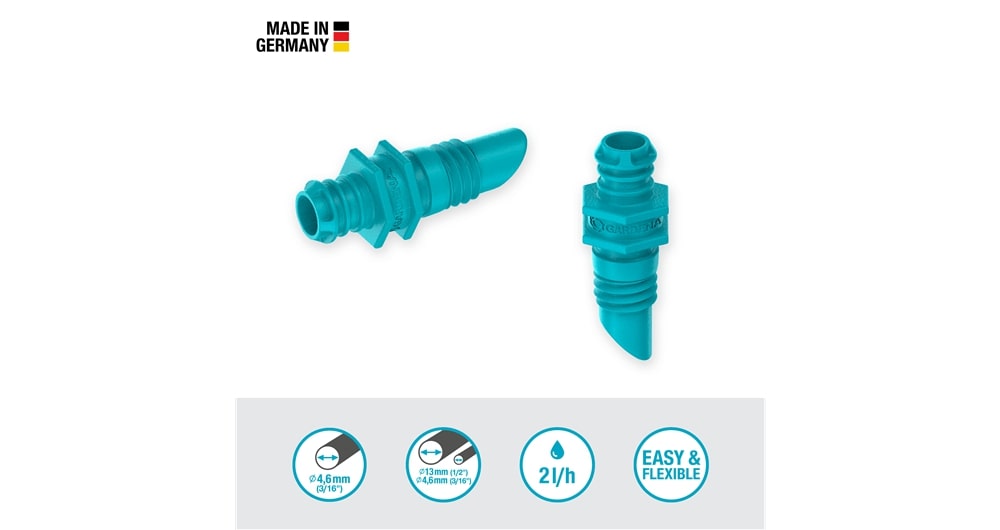Met de Einddruppelaar 2 l/u van GARDENA kun je afzonderlijke potplanten selectief en betrouwbaar bewateren, waardoor je water bespaart. Plaats de Einddruppelaar aan het uiteinde van de 4,6 mm Aanvoerbuis om individuele potplanten effectief van water te voorzien. Als je een opening in de 13 mm Koppelingsbuis maakt met het Montagegereedschap, kun je de Einddruppelaar ook in de buis schroeven en zo langere plantenrijen, zoals een heg, water geven.
