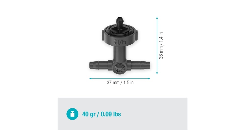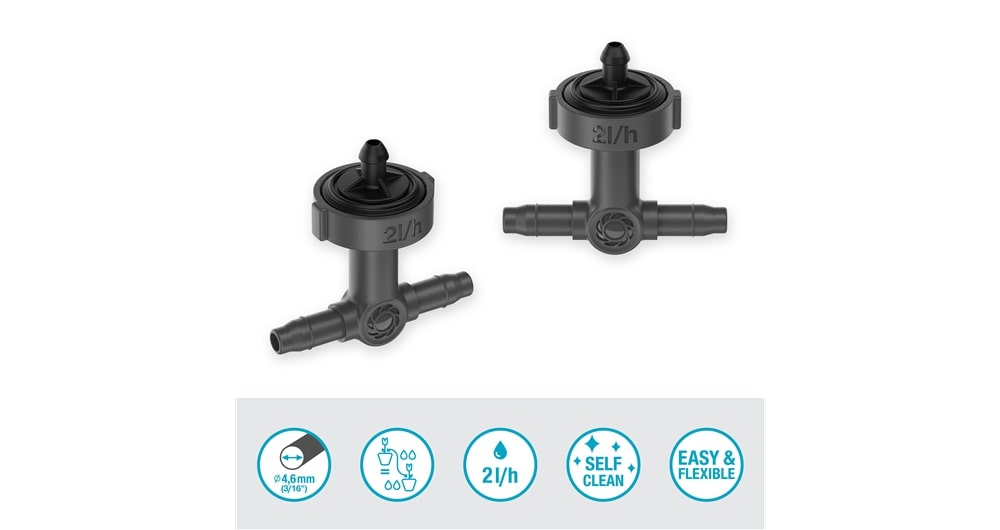 De Seriedruppelaar is drukcompenserend, wat betekent dat de planten dezelfde hoeveelheid water krijgen, zelfs bij hoogteverschillen zoals op balkons of hellingen. Met een constante wateraanvoer van 2 liter per uur is deze druppelaar geschikt voor planten met vergelijkbare waterbehoeften. De Self-Clean-functie is een zelfreinigende labyrinttechnologie, waardoor het niet nodig is om het Micro-Drip-System-onderdeel schoon te maken.