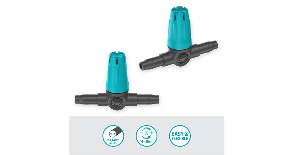 De eenvoudige installatie van de Sproeier voor kleine oppervlakken wordt mogelijk gemaakt door de slimme Easy & Flexible-koppelingstechnologie. Je steekt de sproeier simpelweg in de kruising van de 4,6 mm Aanvoerbuis om hem aan te sluiten, en kunt hem net zo gemakkelijk weer ontkoppelen wanneer dat nodig is. Als de sproeier verstopt raakt, kun je de verstopping eenvoudig verwijderen met de meegeleverde reinigingsnaald.