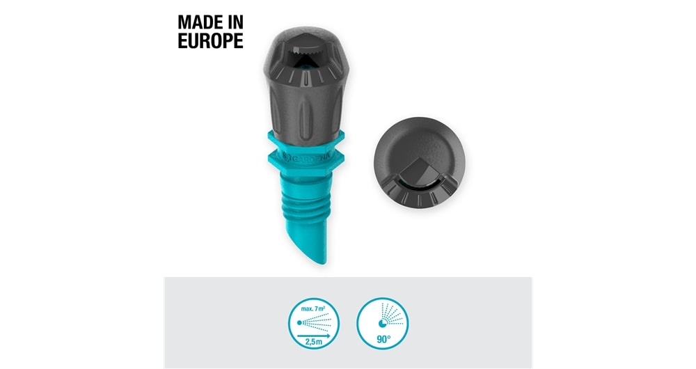 Dankzij het intuïtieve ontwerp van de sproeikop kun je het sproeipatroon direct zien, waardoor je eenvoudig alle GARDENA-Sproeiers van elkaar kunt onderscheiden. Deze Sproeier 90° is een kwaliteitsproduct dat in Duitsland is gemaakt en maakt deel uit van het Micro-Drip-System, waarmee je effectief voor je planten kunt zorgen terwijl je water en tijd bespaart.