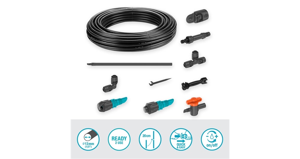 De Micro-Drip-Bewatering Moestuin/Bloembed Set van GARDENA is een perfecte oplossing om efficiënt plant- en bloemperken tot wel 60 m² te bewateren met een fijne sproeinevel. Met deze gebruiksklare set ben je direct klaar om aan de slag te gaan, en je kan de onderdelen eenvoudig monteren in slechts een paar stappen.