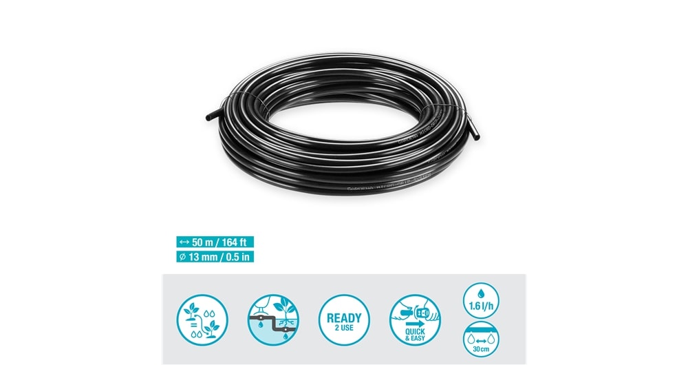 De GARDENA Druppelbuis van 50 meter lang met een debiet van 1,6 liter per uur is ontworpen voor een efficiënte en waterbesparende bewatering van plantenrijen zoals heggen, struiken en buxussen. Deze Druppelbuis is perfect te combineren met de Gardena 13500 MDS Start Set struik/haag 25m en de Gardena 13501 MDS Start Set struik/haag 50m. Hierdoor is het een ideale aanvulling is op je bewateringssysteem.