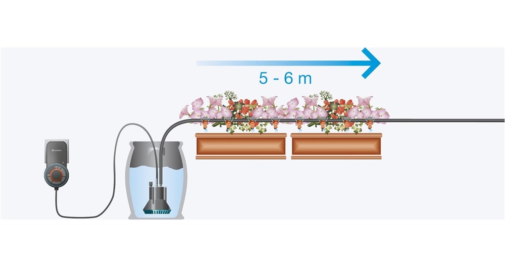 De GARDENA Set voor volautomatische bloembakbesproeiing is ontworpen om tot maximaal zes meter aan bloembakken volledig automatisch te bewateren. Met de ingebouwde timer, die 13 vaste programma's biedt, kunnen je bloembakken eenvoudig worden bewaterd terwijl je niet thuis bent. Deze set is niet afhankelijk van de kraan en maakt het mogelijk om het bewateren van bloembakken direct te regelen vanuit bijvoorbeeld een regenton.