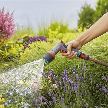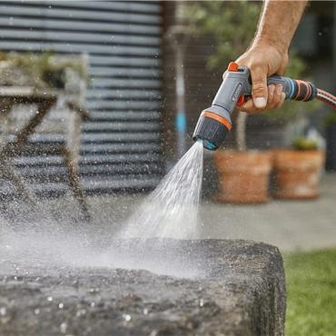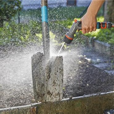 Het GARDENA Comfort multifunctioneel reinigingspistool is ideaal voor zowel effectieve reiniging als besproeiing. Het pistool beschikt over een innovatieve oscillerende waterstraal die bijzonder effectief is voor het reinigen van oppervlakken en tot 40 procent water bespaart vergeleken met de standaard harde straal van GARDENA. U kunt kiezen uit drie andere spuitstanden: harde straal, vlakstraal en nevel.