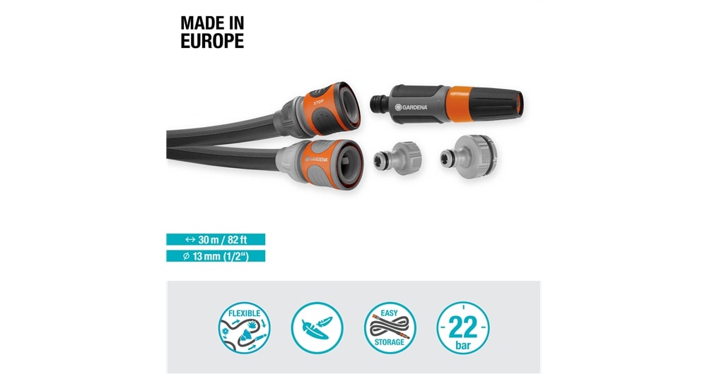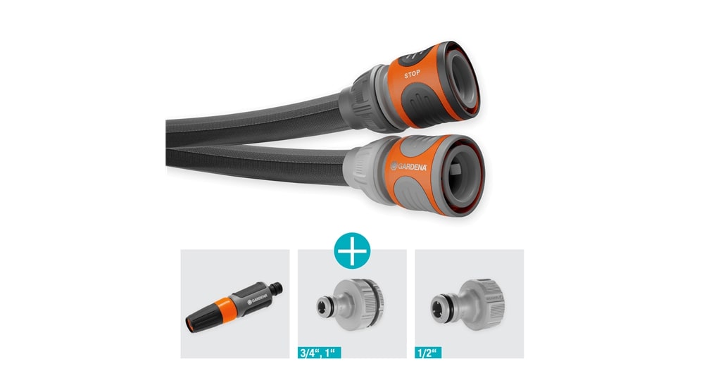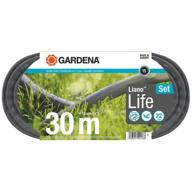 De Textielslang Liano™ Life 30m Set van GARDENA is perfect voor kleine tuinen en direct klaar voor gebruik. Met een diameter van 13 mm (1/2") is deze veelzijdige textielslang ideaal voor bewatering van korte en middellange duur. De set bevat de 15 meter lange Liano™ Life-slang en voorgemonteerde Original GARDENA System-onderdelen, waaronder het Liano™ Slangstuk, de Liano™ Waterstop, een reinigingspistool en twee kraanstukken. Een van de kraanstukken heeft een geïntegreerd reduceerstuk, zodat je de slang op drie verschillende kraangroottes kunt aansluiten.