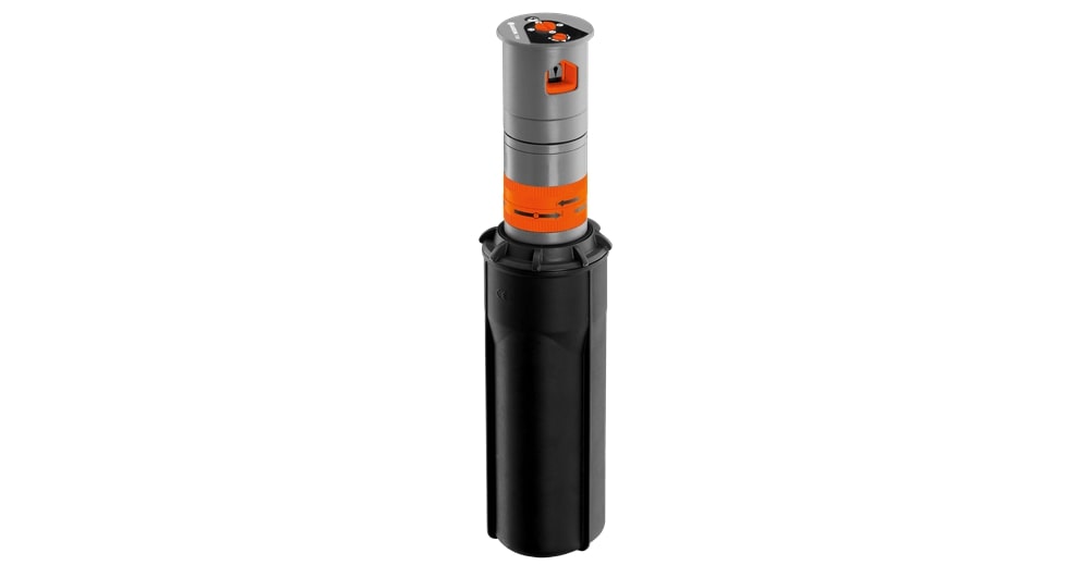 Het bereik is variabel tussen 6 en 11 m voor het afzonderlijke oppervlak instelbaar. De sector die moet worden besproeid kan traploos (zonder gereedschap) op de sproeierkop worden aangepast van 25 tot 360°. Hiermee kunt u kleine sectoren of in een volledige cirkel besproeien. Door de geheugenfunctie gaat de sproeier automatisch terug naar de ingestelde sector, ook als de sproeierkop handmatig is gedraaid. Zo wordt altijd het juiste gebied besproeid.