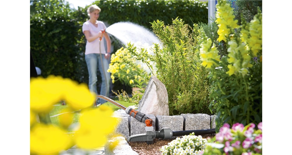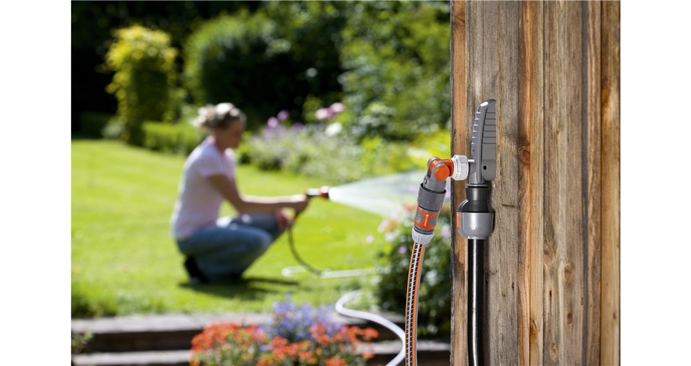 Het water wordt via de GARDENA Aanvoerbuis aangevoerd, waardoor de waterplug functioneert als vervanging voor een traditionele waterkraan. Zodra een tuinslang op de wateraansluiting met automatisch stopventiel is aangesloten, kan het besproeien beginnen. Bij het loskoppelen van de slang stopt de waterstroom automatisch. De draaibare aansluiting voorkomt knikken in de slang, waardoor hinder tijdens het gebruik wordt voorkomen.