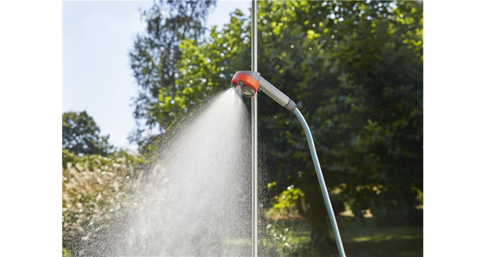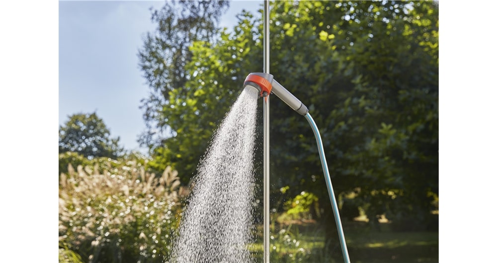 Met de GARDENA tuindouche trio wordt buiten douchen net zo comfortabel als douchen in je badkamer. Dankzij het driepootstatief is de douche eenvoudig overal te plaatsen. De flexibele en afneembare douchekop, die is verbonden met een 1,3 meter lange slang, biedt meer bewegingsvrijheid voor douchen in de tuin.