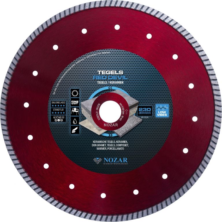 De RED DEVIL is een diamantzaagblad dat snel en nauwkeurig snijdt, met een kwalitatief goede zaagsnede die niet splintert en een zeer nette afwerking achterlaat. Het stamblad is uitgerust met koelgaten om oververhitting te voorkomen tijdens het zagen van verschillende materialen, zoals natuursteen, geglazuurd beton en keramische tegels met beton. Deze veelzijdige zaag is ideaal voor hoveniers, stratenmakers en andere professionals dankzij het dunne blad en de versterkte flens. De hoge segmentering en doorlopende rand zorgen voor een efficiënte zaagsnede en een hoog rendement.