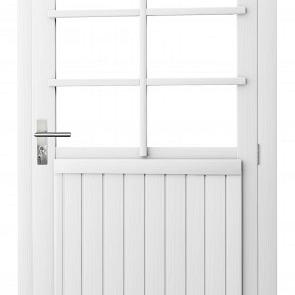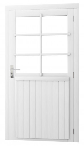 Vuren enkele 6-ruits deur extra breed inclusief kozijn, rechtsdraaiend. 112x201 cm, wit gespoten.