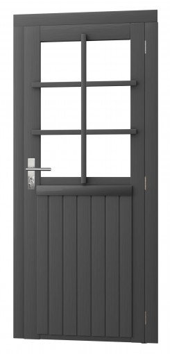Vuren enkele 6-ruits deur inclusief kozijn, rechtsdraaiend. 90x201 cm, antraciet gespoten.