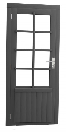 Vuren enkele 8-ruits deur inclusief kozijn, linksdraaiend. 91x201,5 cm, antraciet gespoten.