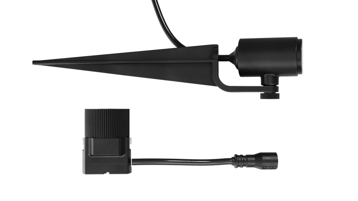 Deze kleine spot wordt standaard geleverd met een beugel en grondpen.